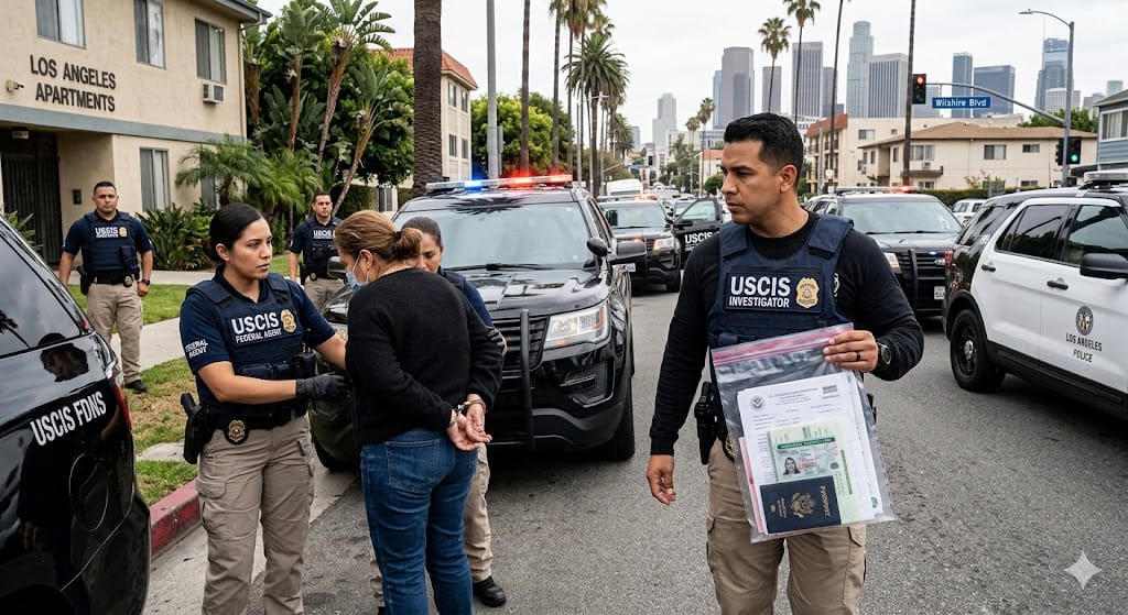 تحقيق احتيال تابع لـ USCIS في لوس أنجلِس أدى إلى توقيف مهاجرة متهمة بإعداد مستندات طبية مزورة ضمن معاملات الجرين كارد، عبر انتحال صفة طبية والإشارة زورًا إلى استيفاء الفحص المطلوب للمهاجرين.