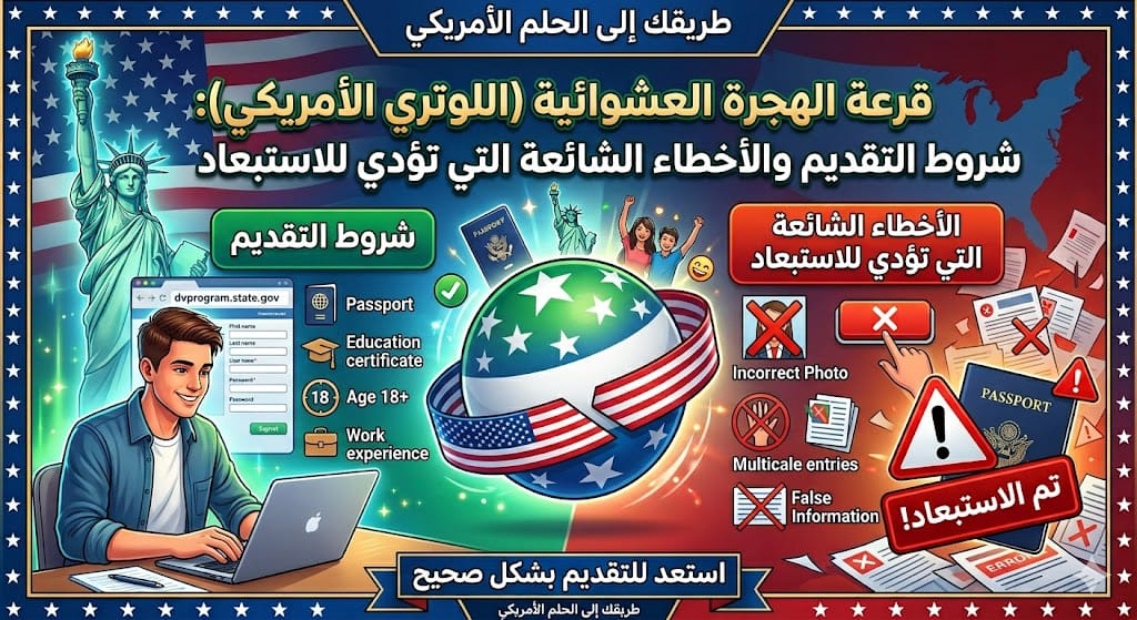 قرعة الهجرة العشوائية DV (Diversity Visa) هي برنامج سنوي بحدود محددة للتأشيرات. تعرف على شروط الأهلية للتقديم، كيفية رفع الصورة الرقمية والاحتفاظ برقم التأكيد، وأخطاء التقديم التي تسبب الاستبعاد، إضافة إلى آخر تحديثات توقف إصدار فيزات DV وكيف تتابع متى تستأنف الإجراءات.