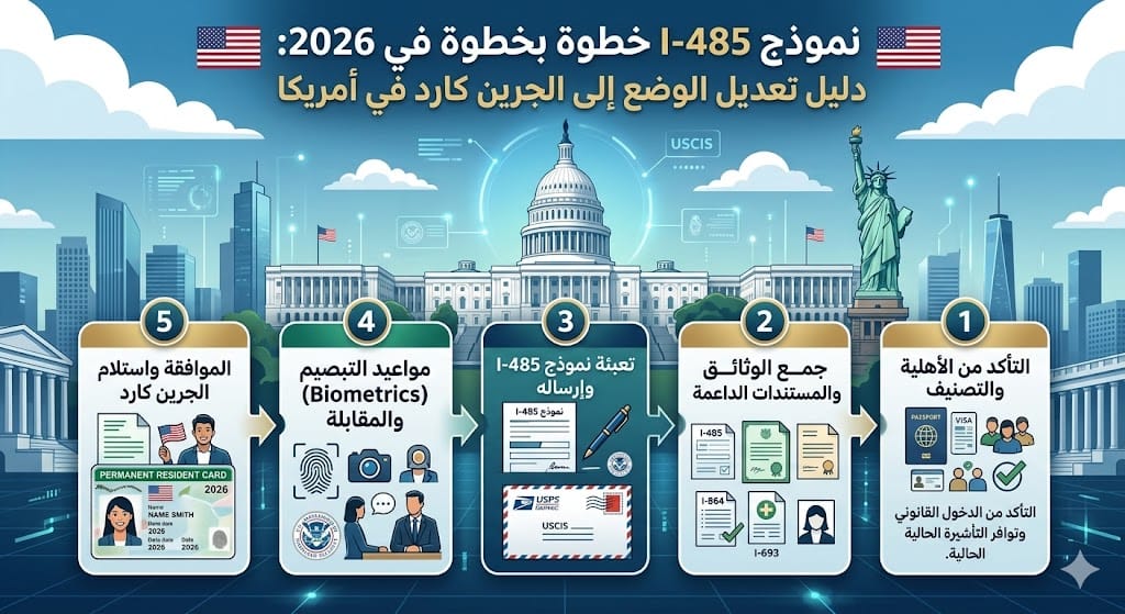 إذا كنت داخل الولايات المتحدة وتبحث عن طريقة تعديل وضعك للحصول على الجرين كارد، فهذا المقال يشرح—بشكل توعوي—خطوات تقديم نموذج I-485 في 2026 اعتمادًا على إرشادات USCIS الرسمية.