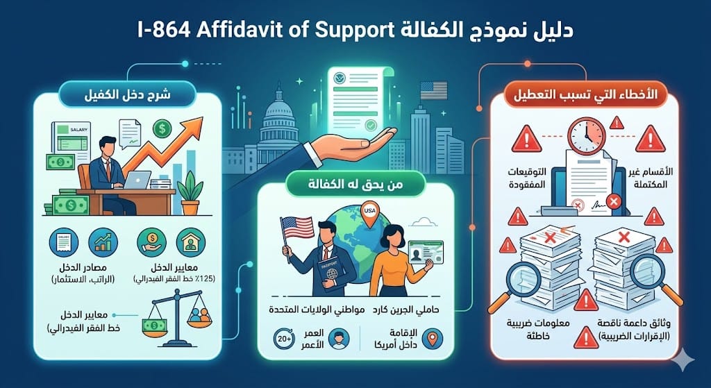 إذا كنت تُحضر ملف هجرة لعائلتك، ففهم I-864 بلغة واضحة يساعدك على تجنب “الأسباب التقنية” التي تعطل الملف: مثل نواقص التوقيع، نقص وثائق الضريبة، أو خطأ في حساب household size أو آلية استخدام الأصول/دخل أفراد الأسرة. وباختصار: قوة ملف I-864 ليست في النية فقط، بل في دقة الأرقام والمستندات.