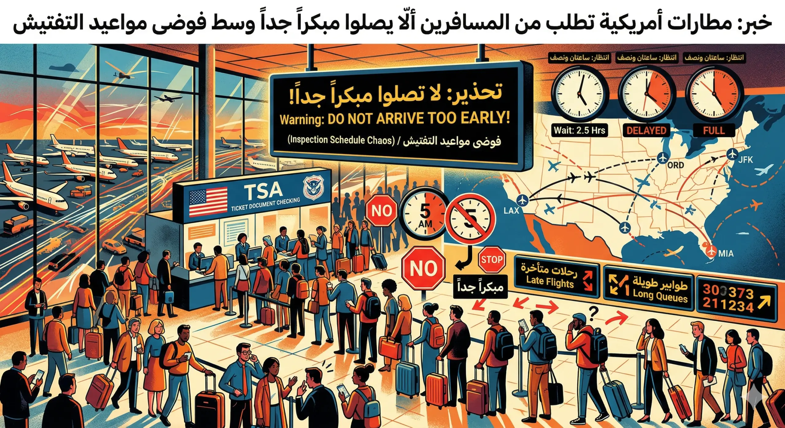 في تطور غير معتاد، طلبت بعض المطارات الأمريكية من المسافرين ألّا يصلوا مبكرًا جدًا، لأن الخوف من التأخير بدأ يصنع ازدحامًا إضافيًا بحد ذاته.